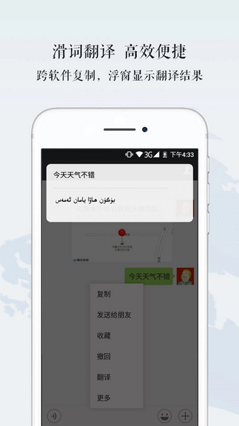 - 滑词翻译:可以在手机任意应用中,通过复制文本快速得到翻译结果;例:浏览网页、微信聊天等更多场景。