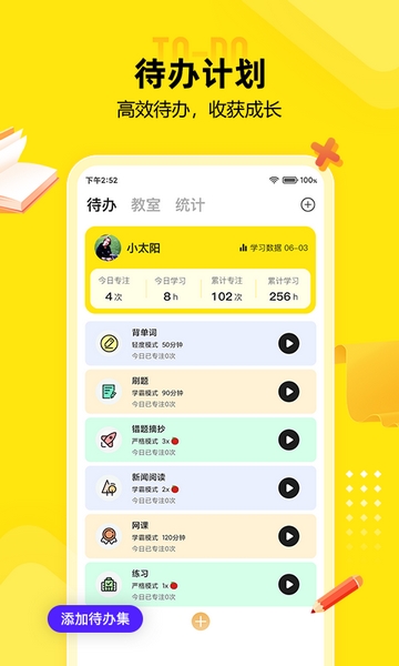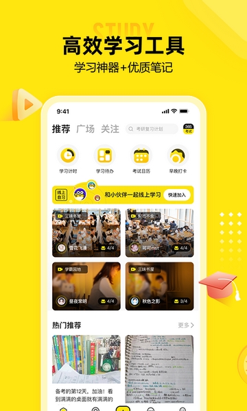 番茄钟+线上自习室+学习笔记+道友组队+学习清单+待办计划+考试日历