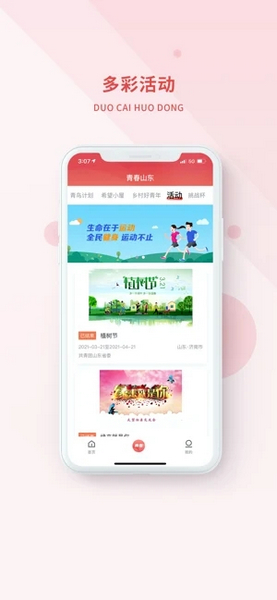 活动展示:“青春山东”APP设置了活动专区,为各高校和各级团组织提供青春风采展示渠道。团组织可将丰富多彩的活动通过APP发布,提供活动宣传、活动报名、活动统计、活动记录等,为线上开展各种活动提供方便。开设“希望小屋”专题,团员青年可以捐助献爱心,也可报名志愿者为困境儿童提供学习和生活上的帮助。