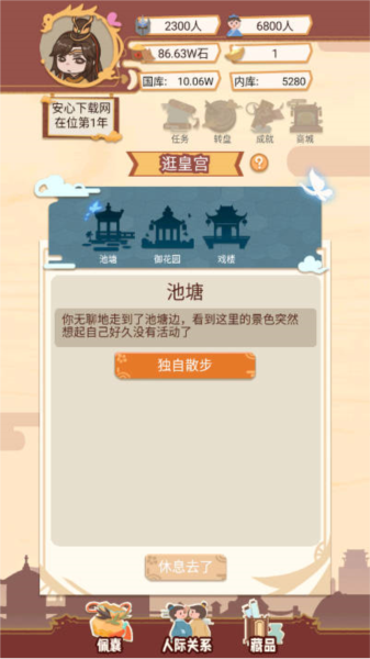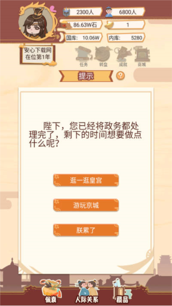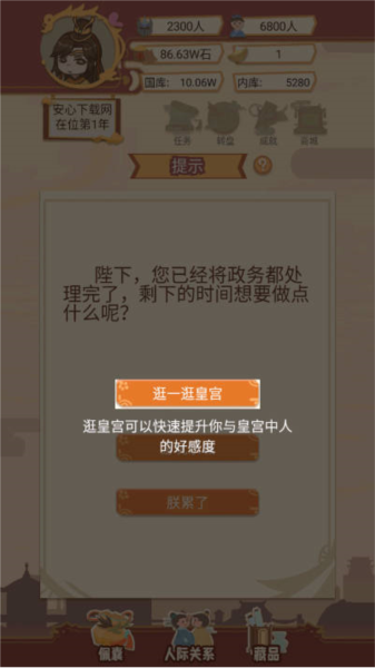 4、内库资金只能用于皇室的开销,玩家每年都可以进行选妃,选妃可以快速补充后宫人员,每次选妃都只能选择一位妃子;