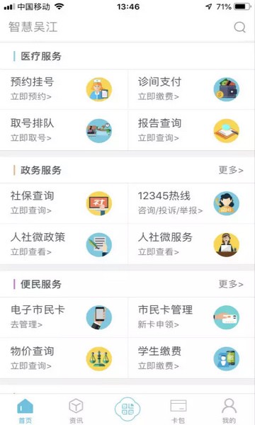 达到条件的市民,可以在线申领吴江市民卡A卡,或通过“市民卡管理”进行补卡申领;申请了吴江“电子市民卡”可以扫码乘公交;可以在线办理苏州惠民休闲年卡;还可以在线缴纳水电煤气费等。