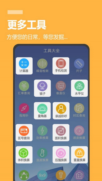 这个工具大全app真的是个宝藏!它里面收录了好多实用的小工具,比如计算器、尺子、手电筒这些日常必备的,还有些像汇率查询、噪音检测这些稍微高级一点的功能。最让我喜欢的是它的悬浮球功能,可以一边用手机一边操作各种工具,特别方便。