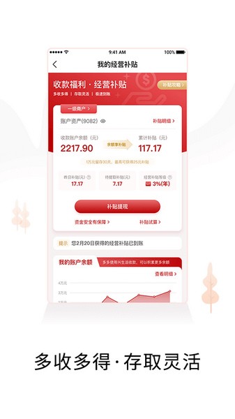 多收款,多留存,多补贴。收款账户全面升级,账户余额每日可赚经营补贴,开通即享。