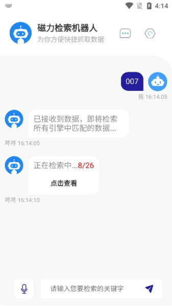MagnetRobot是一款超级好用的资源搜索工具,它通过聊天式的方式让搜索变得更亲切也更高效。不管是找电影、电视剧还是其他内容,都能轻松找到海量资源,而且速度超快,反馈也很及时。