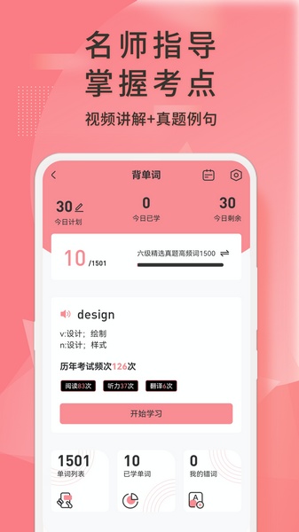 闯关游戏,稳扎稳打趣味背英语六级单词;英语六级单词排行榜每天更新;在学习过程中,利用云技术,纪录分析你的学习过程,帮你总结出生词本,错词本。利用记忆曲线,提供智能复习功能,让你不仅记得快,更加记得牢,轻松应付考试。