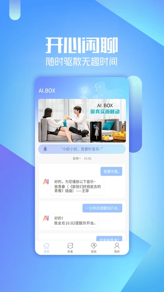 大家只需要通过AIBOX虚拟机器人app来绑定相应的智能设备之后,就可以在手机上非常轻松的进行控制和开关了,便捷的远程交互不仅可以为用户们的生活带来更多便利和智能,也能解锁更多的趣味玩法。AIBOX虚拟机器人这款软件所具备的闲聊模式也可以让大家的生活变得更加有趣。