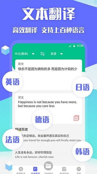 支持中文、英语、日语、韩语、泰语、德语、俄语、法语、西班牙语等几十种热门语言互译,论文、教材、文档领域翻译处于业界领先,翻译效果堪比人工翻译。英文文本翻译、日文文本翻译,做你随时随地的新华字典,不逊于有道翻译、百度翻译