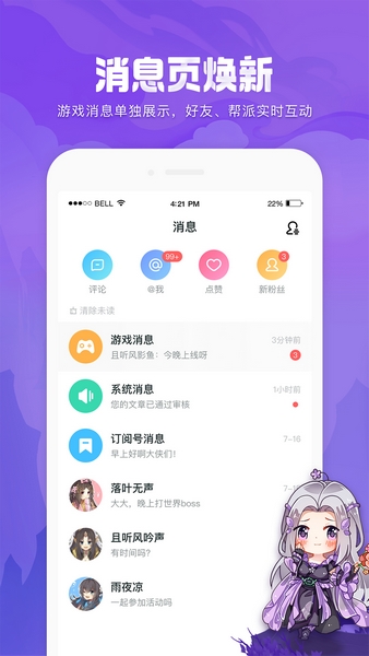 2、好友聊天,关注私信,门派、阵营频道畅聊。社区宇宙频道,随时随地和亲友互动嗨翻天;