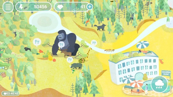 荒漠乐园主要玩法是给沙漠降雨,不同的海拔地形降雨量会孕育不同的动物。绿色的云朵按键是下雨。红色的太阳按键是减少下雨量。升级一定数量的雨林or林地后,过一两天就会出现太阳按键。