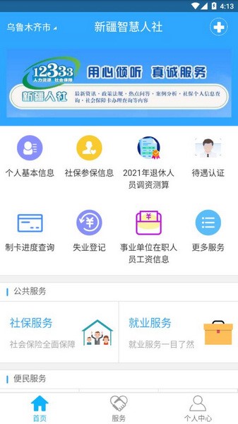 2、在首页,有个人基本信息、社保参保信息、待遇认证、失业登录、退休人员调资测算等;