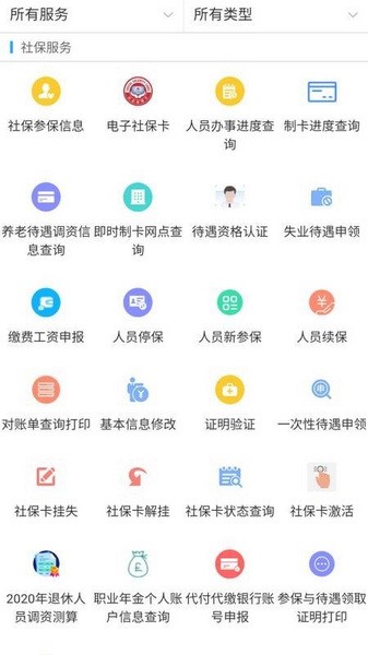 3、点开服务,有电子社保卡、缴费工资申报、人员停保、人员新参保、人员续保等服务,还有社保卡挂失、社保卡解挂、社保卡激活等功能;