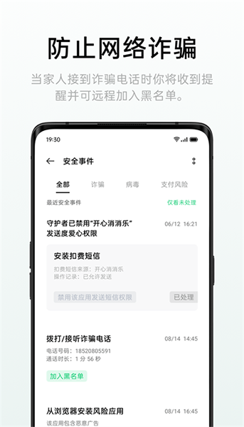 可以及时查看家人手机上出现的诈骗电话、手机病毒及支付风险等安全事件,并远程为家人处理相关事件