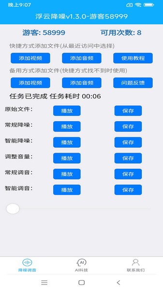 3、选择好音频后,等待一会,就自动降噪或者调音完毕,进行播放试听和保存结果,就可以了。