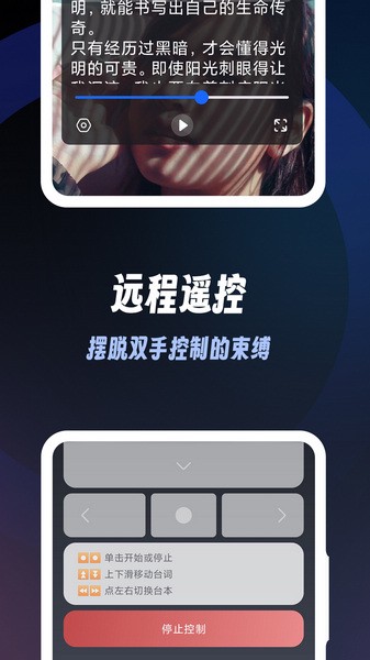 利用另一台手机扫描app中的二维码,即可远程对台词的滚动、切换、暂停和控制,摆脱双手控制的束缚。