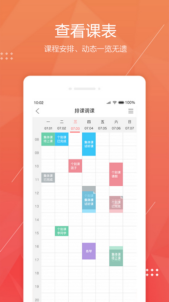 1、课表:快速查看本周课程安排,课前一小时系统自动发送上课提醒,课程调整、考勤结果自动同步到APP。