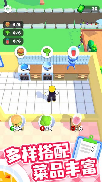 开心厨房是一款3D的餐厅模拟经营游戏,玩家要亲自为客人们服务,从点菜、制作到上菜全都是要靠自己的,所以会比较忙碌。不过有些客人都是点的同一份餐品,所以还不算太难。这里有很多烹饪工具可以使用,每道菜都有不同的制作步骤。在赚到钱之后还可以去开设分店、招募员工,让餐厅带来更多的收入。
