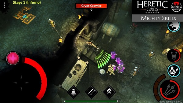 1、异教徒之神的控制系统是直观的,是很好的适应触觉设备,在屏幕左边有虚拟十字线,你可以移动你的角色,而右边的按钮可以攻击和使用技能,只要按下攻击按钮,你的英雄就会自动瞄准最近的敌人。