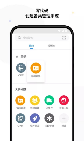 - 全新的应用搭建模式,可以快速创建从销售,运营,营销,到人事管理等各种企业应用