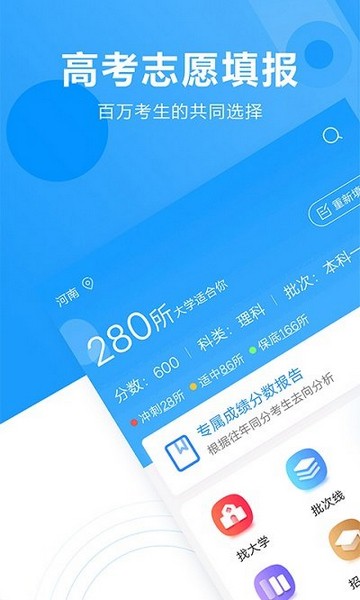 高考志愿填报专家app轻松查询全国2700+所大学的录取分、招生计划、师资、奖学金等信息;