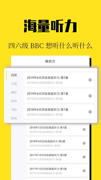 配备听力专项与背单词专项训练:海量四六级/BBC/VOA/TED等听力资源,随时随地练听力、磨耳朵。