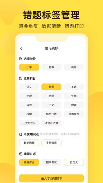 --智能分类,自定义选择或添加标签属性,将错题分类并同时分配给学生