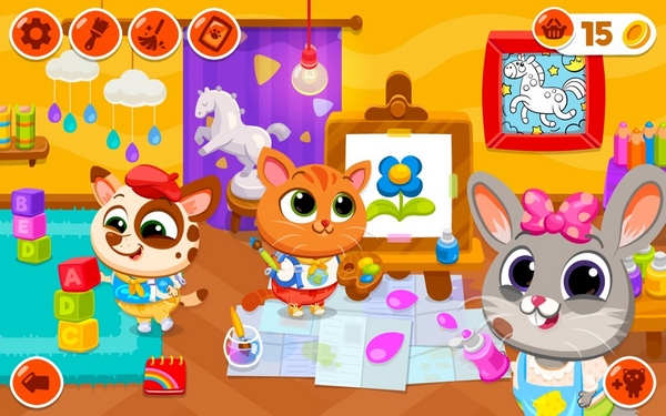 游戏中有虚拟宠物角色,玩家可以给它们打扮、学习和娱乐。美术方面有绘画和贴纸装饰,音乐则包括弹钢琴和其他乐器演奏,还有健身活动和数学语言训练,寓教于乐。餐厅模块让孩子们当主厨,制作美食,同时还有安全过马路的小游戏。