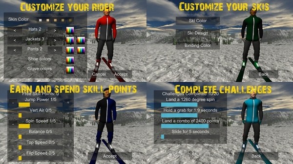 1、自由滑雪模拟器游戏有很多等级,不断的升级,可以解锁更多的滑雪场景,也可以学习更多的滑板操控技巧。