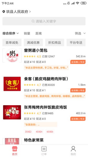 2、提供了排序和筛选功能,可以根据销量、距离等筛选推荐的店铺;