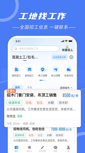 1、【建筑找工人】:多样建筑工种细分,高等效率工地招工,直接电话联系工匠,技术好,有资质,平台交易有合同和发票。
