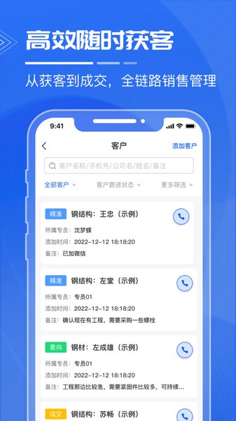 精准客户获取:随时随地持续获取全国精准客户,漏斗式客户管理。