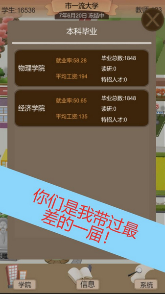 最让我觉得有趣的是,游戏里的每一分钱都要精打细算。如何平衡学费和招生人数,怎么规划商业街和食堂的收入,这些都考验你的经营能力。我还发现,提升教师水平和学生素质对学校的发展非常重要,尤其是那些能带来高捐款的优质毕业生,简直是学校的“金字招牌”。
