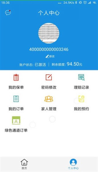 5、在软件“个人中心”中,拥有的功能是:我的保单、密码修改、理赔记录、我的订单等。