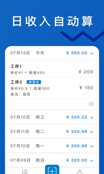 轻松计件app是一款用于计件工作的记录类app。这款可以在工作的时候随时记录工作数量,并自动计算出日工资和月工资,记录每天的工时。也可用于记录其他工作的工时和工资,方便计算结清时的工资。软件的使用方法很简单,操作很方便,计件速度也很快准确,避免出现错误,且最后的统计条目排列清晰,有无遗漏很容易就能看出来,轻松计算自己的工资收入。