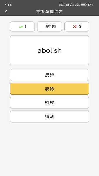 3、在练习过程中,通过展示的英语单词快速选择正确答案;