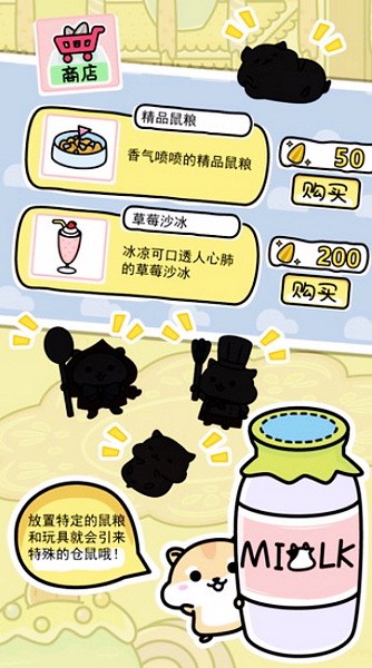 2、您可以通过放置不同种类的物品吸引仓鼠前来下面我们一起来购买物品吧!