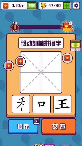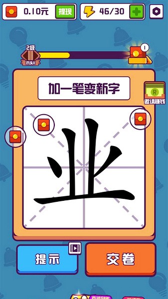 5、闯关的汉字玩法,不再是填成语了,而是变化笔画来填字了。
