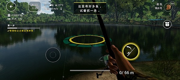 7、投掷钓点的距离受鱼竿配置和抛竿方式影响,比如新手竿即使按F11切换抛竿方式也不会超过20m,但lz配置的中级路亚竿可以鼠标右键选择想要的钓点(最远可达50米)。