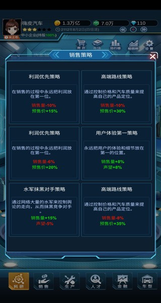 在汽车研发完成后就可以召开属于你的新车发布会了!你需要在发布会召开前先做一些准备工作,比如调整新车售价,选择营销策略,邀请明星等,在这些工作完成后你的新车就可以在发布会上闪亮登场了!发布会召开时你还可以看到网友和媒体的弹幕,从这些弹幕你将可以大概看出新车的受欢迎程度。