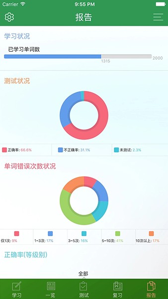 TOEIC精选词汇所有的学习和测试过程都有记录并用图表展示,让你对自己的学习进度一目了然!