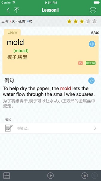 ・录音功能可以让您在学习的时候录下自己的声音进行照,同时也可以使用备注功能写下自己对单词一理解或注释。