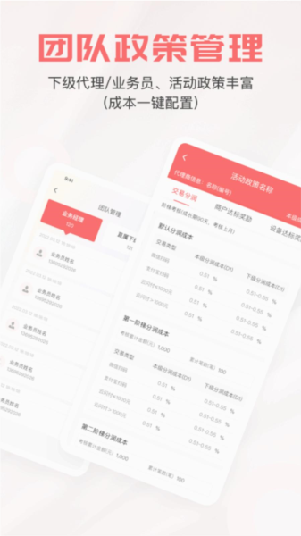 团队政策管理:支持下级代理/业务员展业、丰富的活动政策,满足多种场景和业务,支持成本一键配置;