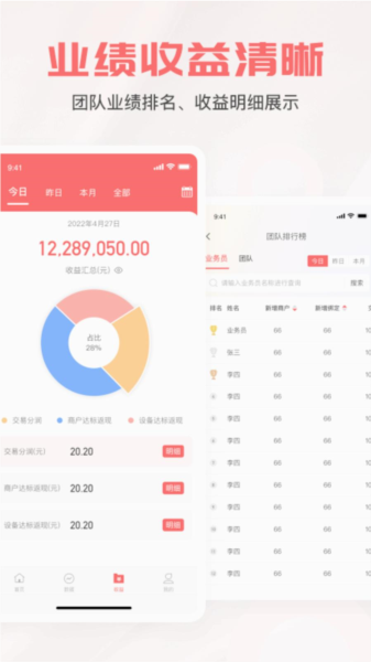 业绩收益清晰:团队业绩排名、收益明细展示清晰明了,提升管理效率;