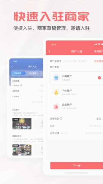 快速入驻商家:商家便捷操作入驻,支持商家草稿管理,支持邀请商家入驻;