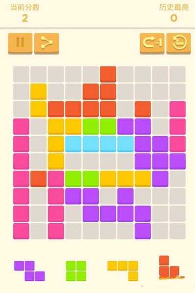 点击L方块和3格长条,改变方向,将L方块放在左下角,将田字方块放在右下角。