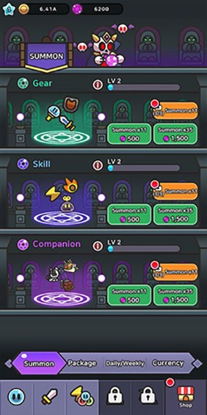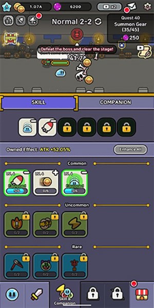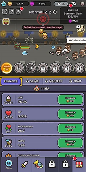 4、再点击召唤按钮即可抽取并升级我们的武器了,任务失败的话也不需要担心,仅需放置在那挂机升级史莱姆属性即可