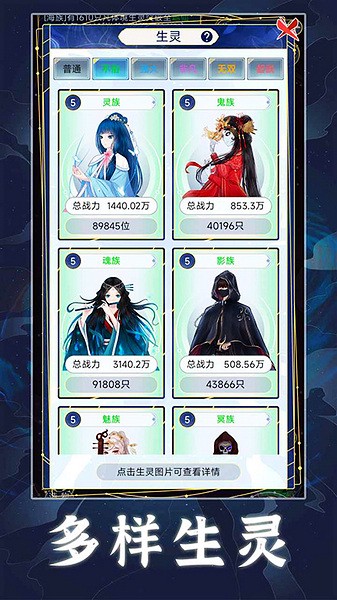 天道创造中数十种生灵种族可以孕育和培养,每个种族都有自己的特点和特殊强者,各族之间也有着专属的际遇。