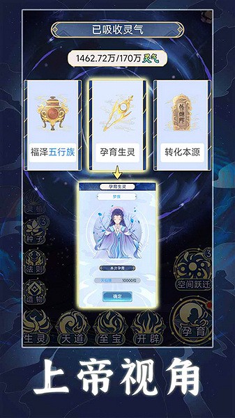 2、游戏目前有孕育、开辟、天道、至宝、生灵等玩法;