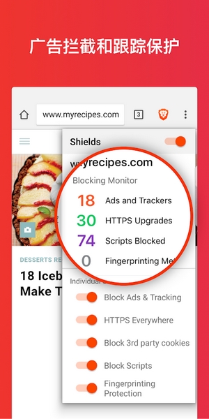 Brave网络浏览器应用程序设计有内置的广告拦截器(弹出窗口阻止程序)。Brave的免费广告拦截器可以在你浏览网页时保护你免受跟踪广告的侵害,保护你的隐私。