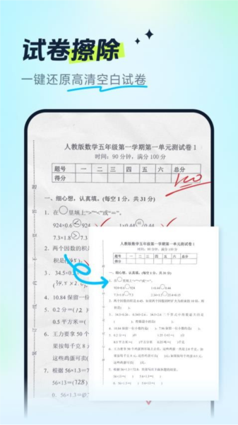 1、智能试卷擦除:自动去除答题区的手写内容,确保电子版试卷干净整洁。
