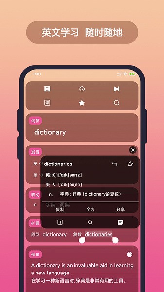 我特别欣赏生词本这个贴心设计,那些稍纵即逝的陌生词汇,只需轻轻一点,便能纳入我的学习清单,便于日后复习。而“背单词”功能更是强化记忆的利器,它让我在碎片时间里也能巩固词汇,显著提高了我的英语水平。至于它的多种搜索方式,无论是关键词搜索还是语音输入,都极大地提升了查找效率。自定义主题界面,更是让学习变得不再单调,增加了使用的愉悦感。